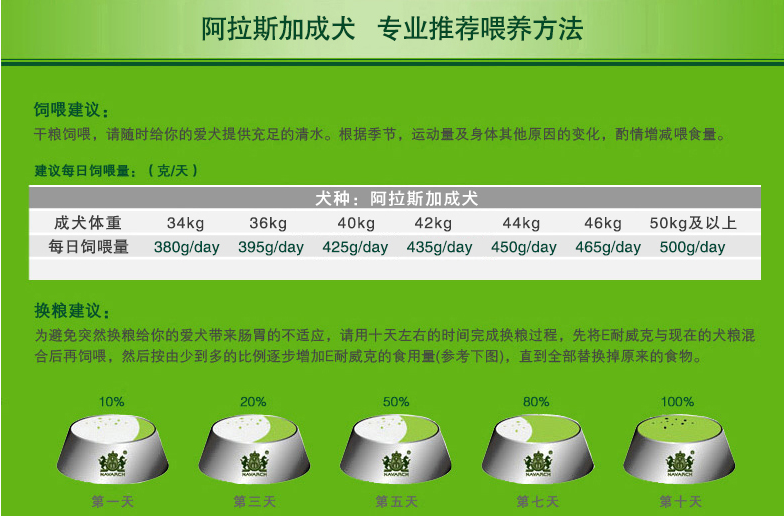 干糧飼喂,請隨時給您的愛犬提供充足的清水。根據季節、運動量及身體其他原因的變化,酌情增減喂食量。
